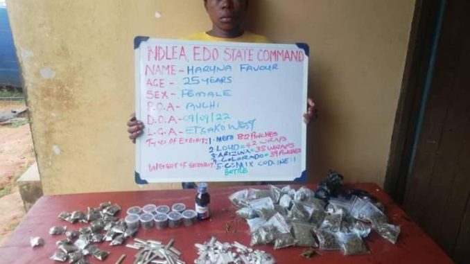 From other parts of the country, a 25-year-old pregnant woman, Haruna Favour, was arrested in Auchi, Edo state on Friday 9th Sept with 82 pinches of methamphetamine as well as various quantities of Loud, Arizona, Colorado variants of cannabis and codeine based cough syrup.