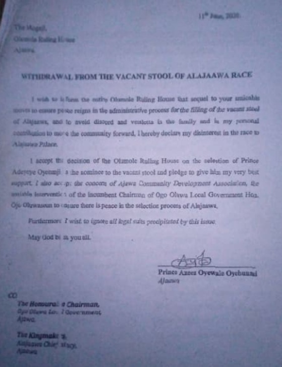 “However, as one of the most authentic candidates for the throne of Alajaawa, my younger brother with the name Thompson Adeyeye forged my signature that I’m not interested in the kingship of the town and proceeded to the Gov. Seyi Makinde and the governor approves this forged document bearing my signature with an headline ‘Withdrawal From The Vacant Stool of Alajaawa Race’.