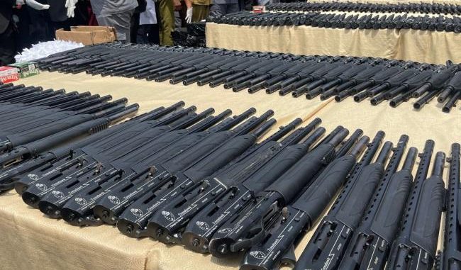 Briefing journalists at Onne Port, Rivers State on Monday where the items were seized, the Comptroller General of Customs, Bashir Adewale Adeniyi, said the arms and ammunitions include 764 units of Tomahawk Jojef Magnum Black Pump Action Rifles; 10 units of VC Verney Caron Gunmakers Jojef Magnum Silver Pump Action Rifles, 50 units of VC Verney Caron Gunmaker Double Barrel Rifles, 20 units of VC Verney Caron Gunmaker Single Barrel Rifles, Exclusive Series, and Sterling High-Quality Live Ammunition.