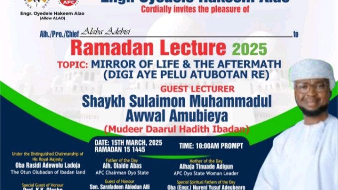 An All Progressives Congress (APC) chieftain in Oyo State and former gubernatorial aspirant, Engineer Oyedele Hakeem Alao, will hold his yearly Ramadan lecture on Saturday, March 15, 2025.